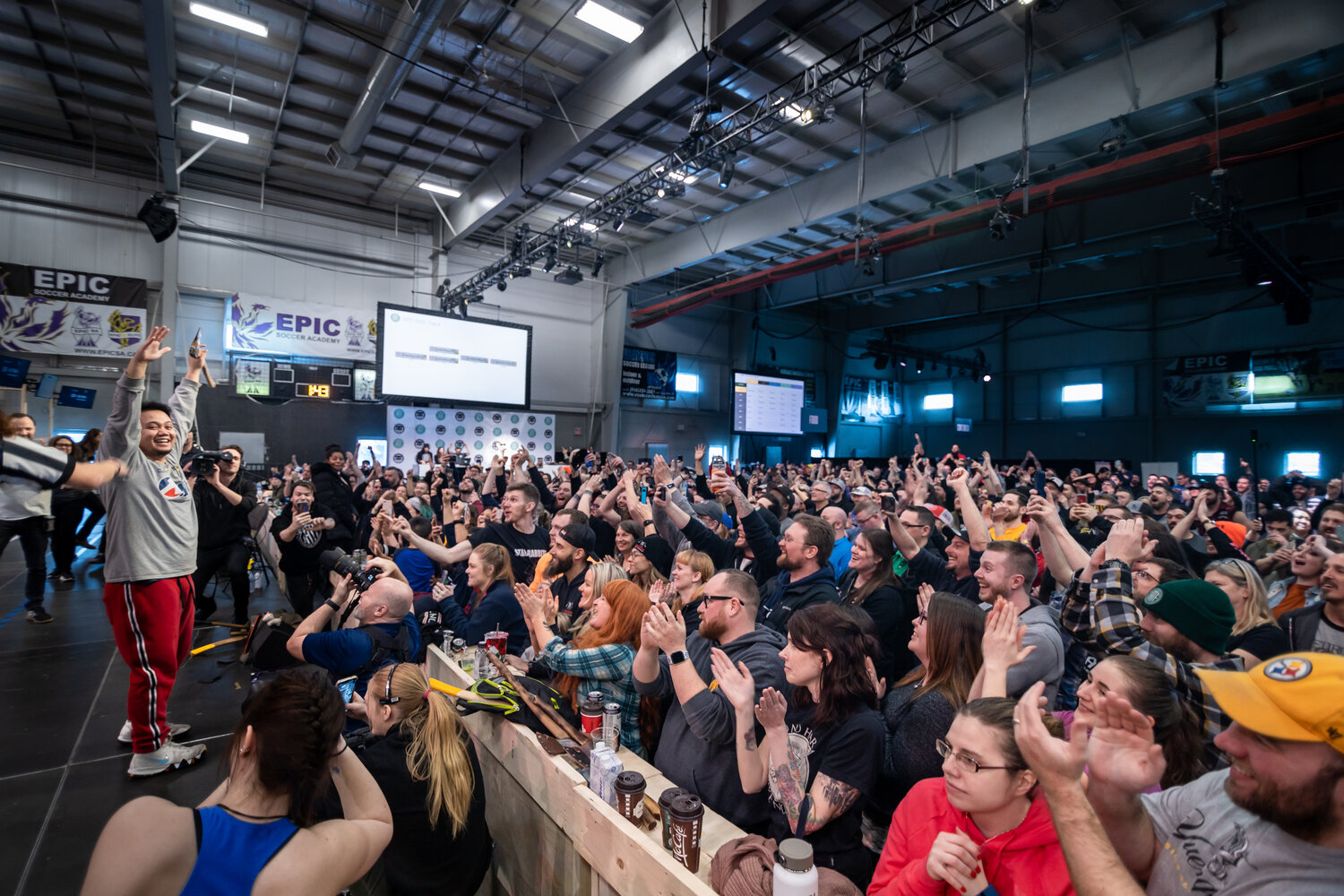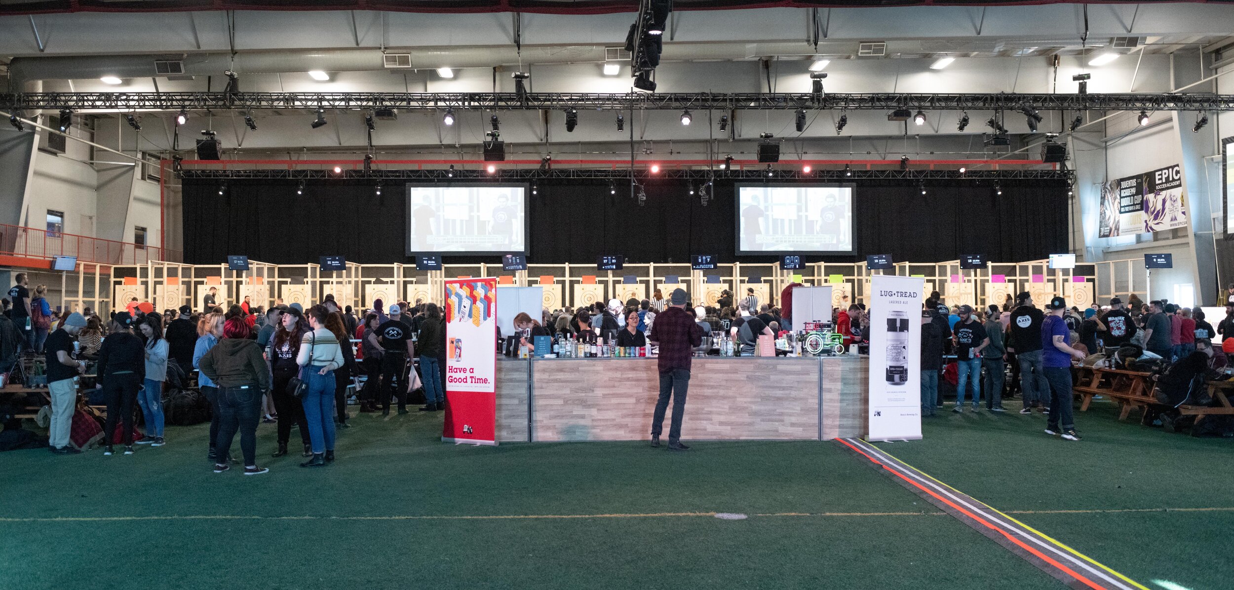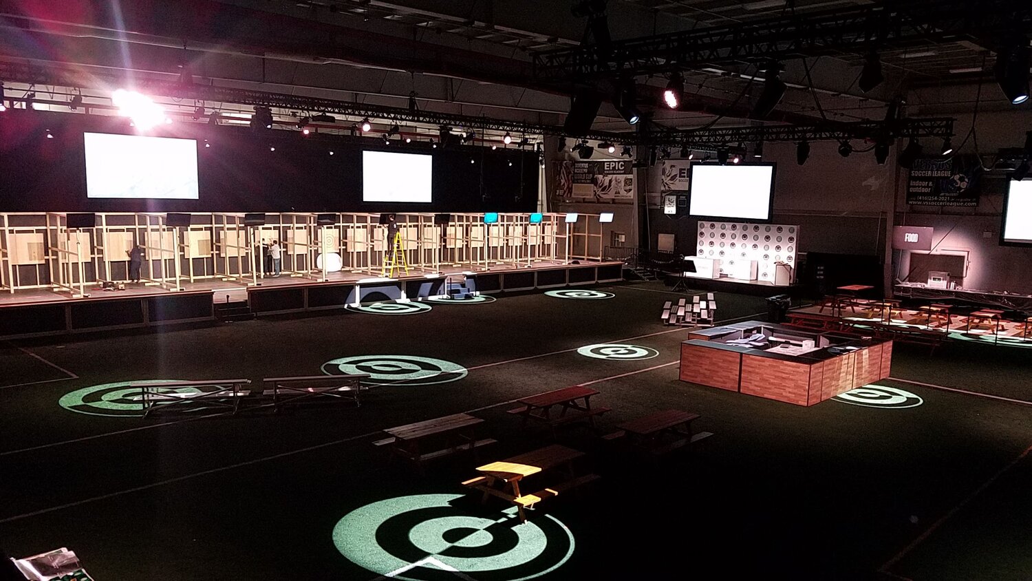 Live stream of championship, announcer booth, food station, bar, merch area